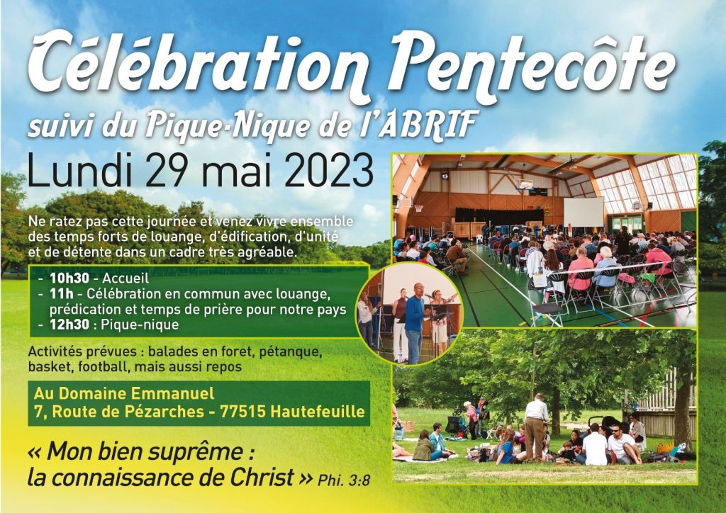 Chaque année, l’Association Baptiste en Région Île de France (ABRIF) organise un pique-nique à l’occasion du lundi de Pentecôte pour se retrouver avec d’autres Eglises de notre famille d’Eglise : l’Association Baptiste. Au programme : un culte en commun, un pique-nique et des temps de détente ensemble.